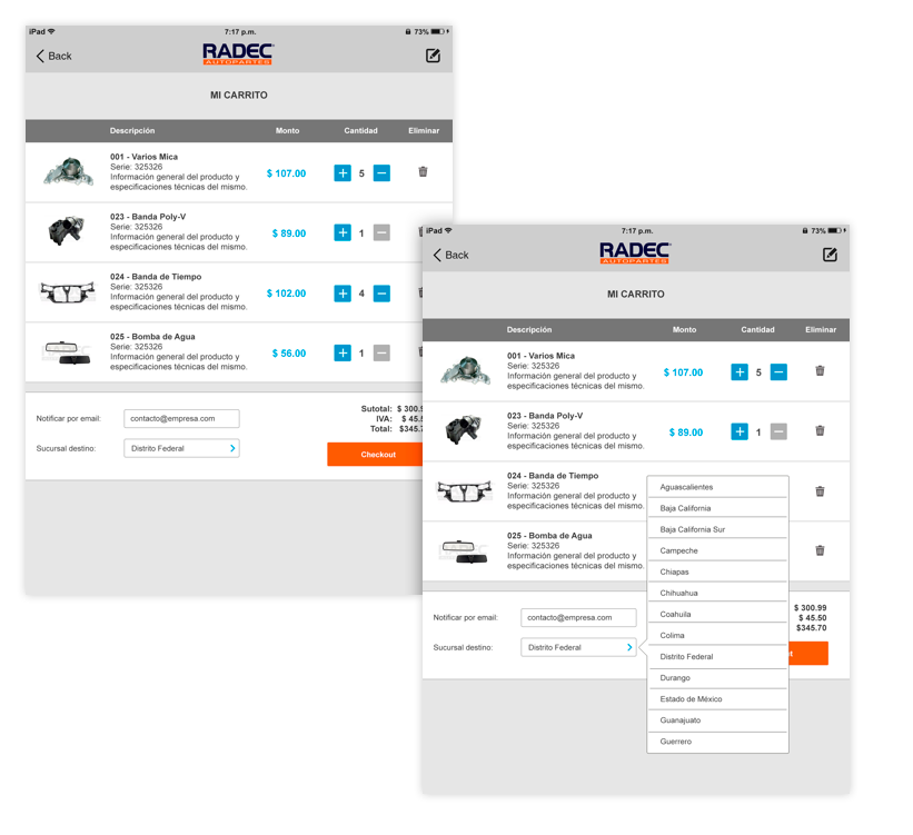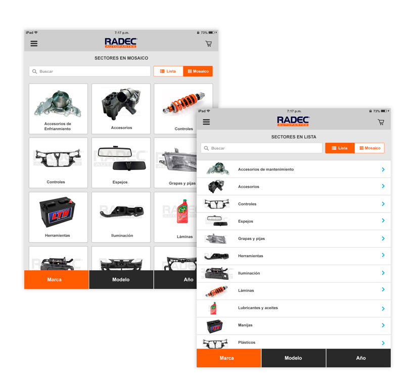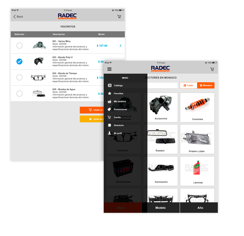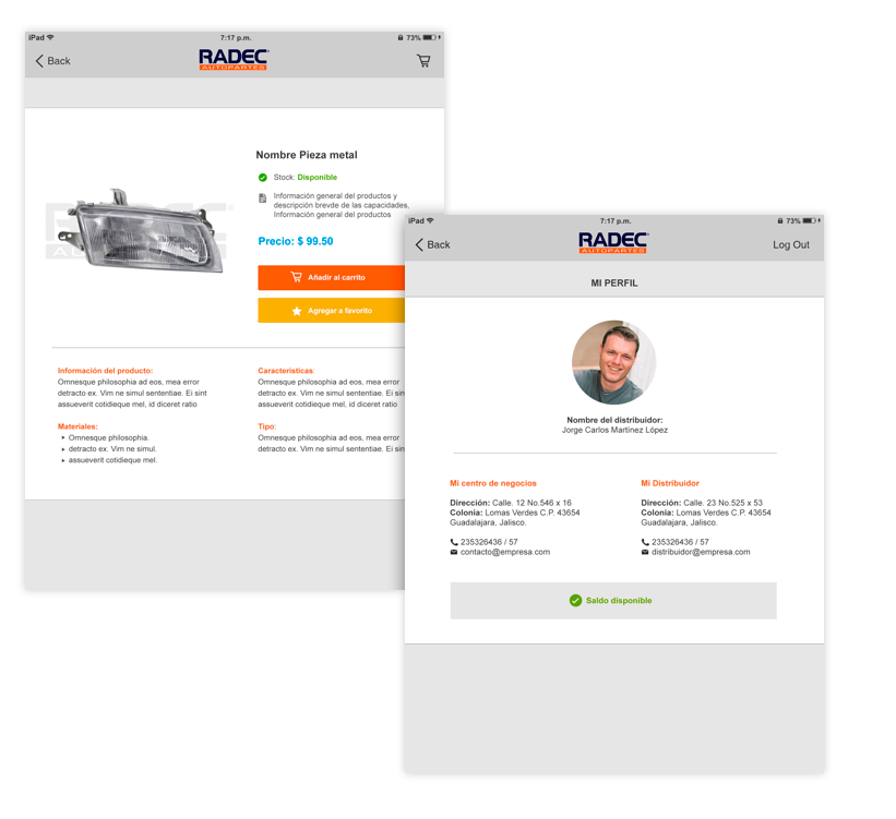 Diseño de aplicación para la empresa Radec, empresa que se dedica a la importación, comercialización y distribución de autopartes de colisión de los mejores fabricantes del mundo, autorizados y certificados con los estándares mas estrictos de calidad. Este trabajo se realizo en colaboración con la empresa Apto Comunicación.